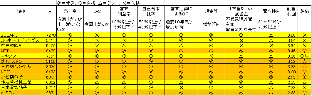 ここから、配当利回りが2.2%以上の銘柄をピックアップすると、以下の12銘柄になりました。